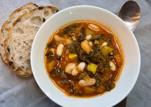 Een heerlijke verwarmende comfortsoep. Afhankelijk van het seizoen kun je verschillende koolsoorten gebruiken. Palmkool in de zomer of boerenkool in de winter. Koop de boerenkool dan op de stronk, zodat ze wat " bite" heeft. Het oogt ook mooier.